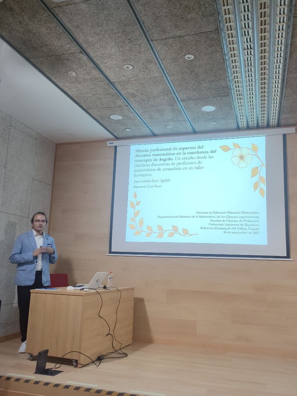 El viernes 26 de septiembre de 2025, en la Sala de Grados del Edificio G6 de la Facultad de Educación de la UAB, tuvo lugar la defensa de la tesis del miembro de GIPEAM, Juan Rave Agudelo, titulada «Mirada profesional de aspectos del discurso matemático en la enseñanza del concepto de ángulo. Un estudio desde las prácticas discursivas de profesores de matemáticas de secundaria en un taller formativo».